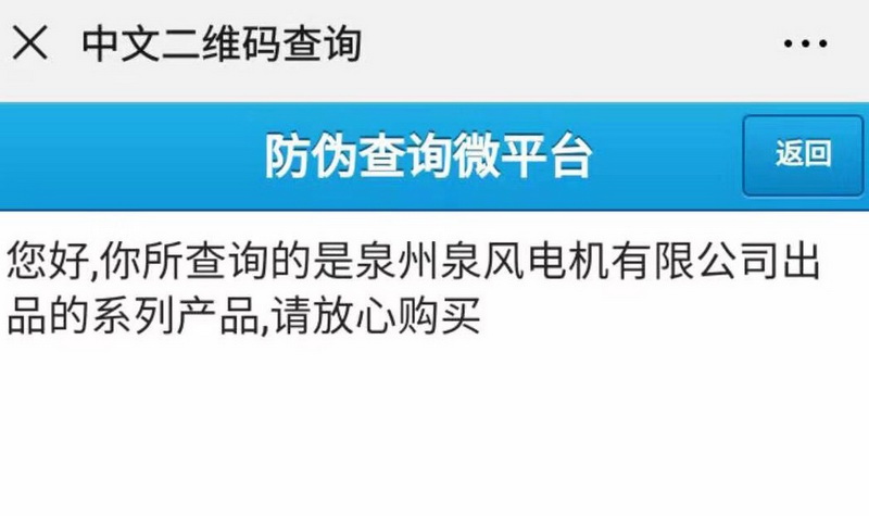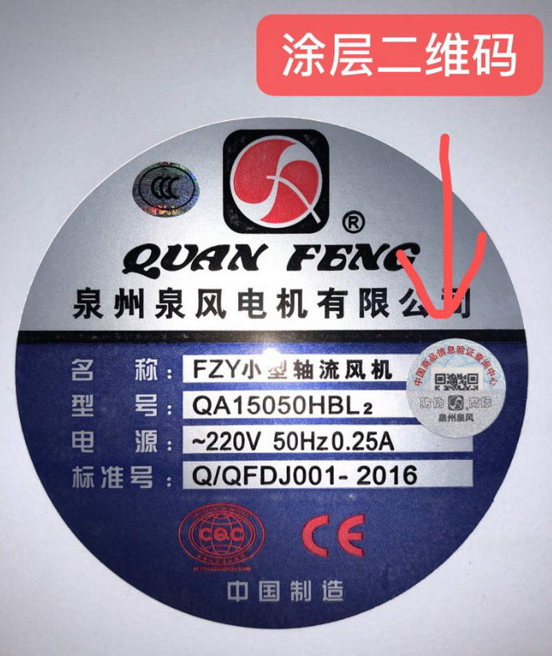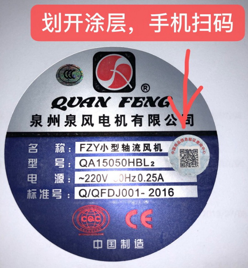 Since July 18, 2019, all fans produced by our company have been attached with QR code anti-counterfeiting label. Scratch off the coating can be scanned by mobile phone. One machine, one yard, the first scan shows the genuine Quanfeng. Scanning for the second time will prompt non first query, beware of counterfeiting.